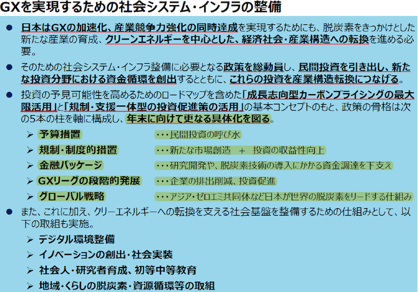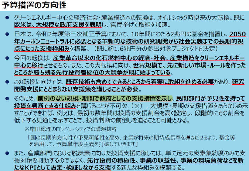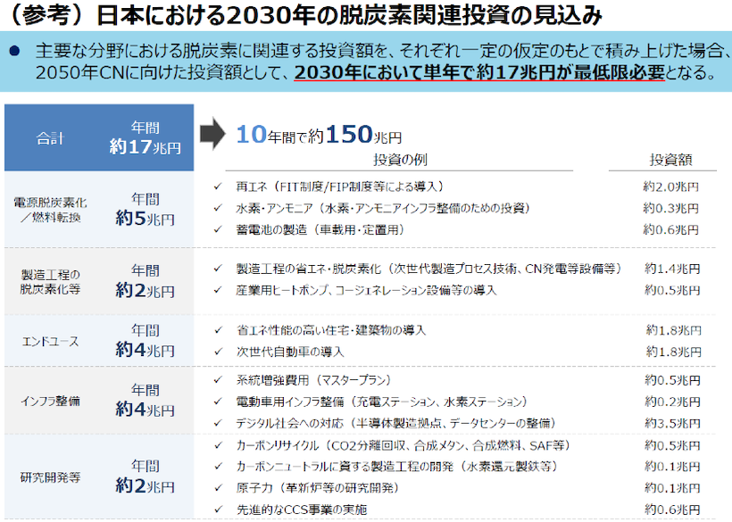 第二に、これに対して、今回の“中間整理”では、具体的に何が決まったか?である。 “今後、脱炭素関連投資として年間17兆円、今後10年間で約150兆円が最低限必要”と試算が示されたことは進展ではあるが(参考までに日本のGDPは約550兆円で、うち個人消費が約300兆円、民間投資が約90兆円、公共投資が約30兆円など)、 そのための“予算措置”や“規制・制度的措置”は「年末に向け更なる具体化を図る」とされ、具体的な決定事項の進展は殆どなかった、というのが筆者の印象である。 特に、予算措置に関しては、「前例のない規模・期間で政府として支援措置を示し、民間部門が予見性を持って投資を判断できる仕組みを講じることが“不可欠“」とまで記載されながらも、具体的には決まっていない。 なお、ウクライナ危機・電力需給ひっ迫を踏まえ、LNGを含めエネルギー安全保障の重要性が再確認され、原子力などを最大限活用するとされた。これらを評価する報道も見られるものの、具体的な決定事項の進展は殆どない印象であり、年内にも発表予定の「新LNG戦略」などによる具体策が待たれる。