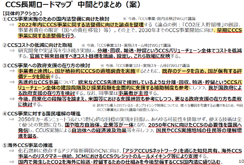 第一に、政府が「2030年までのCCS事業開始に向けた事業環境整備」にコミットし、2022年内にCCS事業に関する法整備の論点を整理し、 その後、早急に法整備を行うことである。特に、「長期責任」の法整備が求められており、地下に貯留したCO2が漏れ出ていないことを、無限の期間にわたって企業が責任を持つとなると、 誰もCCS事業を行わないため、一定の期間後は、国に責任が転嫁することなどが想定されている。