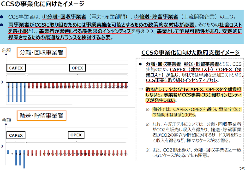 第二に、政府支援の在り方として、「政府として、少なくともCapex、Opexの全額負担しないと、事業者がCCS事業に取り組むインセンティブが発生しない」、 「海外では、Capex・Opexを通じた事業全体での補助率はほぼ100%」などと整理されていることである。まだ決定事項はないが、この資金負担面での議論の進展は、とても大きい印象である。