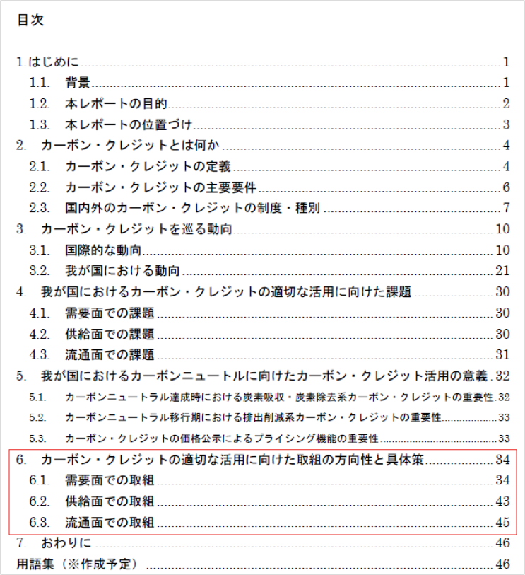政府は3月24日、「カーボン・クレジット・レポート(案)」を公表したので、考察する。 カーボン・クレジットとは、「植林などによる温室効果ガス排出削減量を、企業間などで取引できるように認証されたもの」であり、 企業は同クレジットを購入することにより、自社の温室効果ガス排出量を相殺することができる。 ただし、カーボン・クレジットには“すでに政府公認のもの“(J-クレジット、JCM)だけでなく、国内外の民間によるボランタリーなカーボン・クレジットなど様々なものがあるため、 企業としては「カーボン・クレジットを購入してはみたものの、正式に排出削減量などとして認められるのか?」など曖昧なところが多かった。同レポートは、「カーボン・クレジットとは何か?」や 「国内外のカーボン・クレジットの動向」などをまとめたものであるが、最も注目されるのは、下の目次の、第6章の「カーボン・クレジットの活用の方向性」 (どのクレジットを、どの目的での排出削減量として認めるか?)であろう。