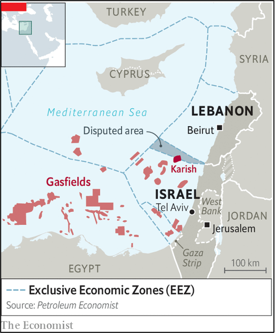 (イスラエルとレバノンのEEZ境界係争、出典:The Economist)