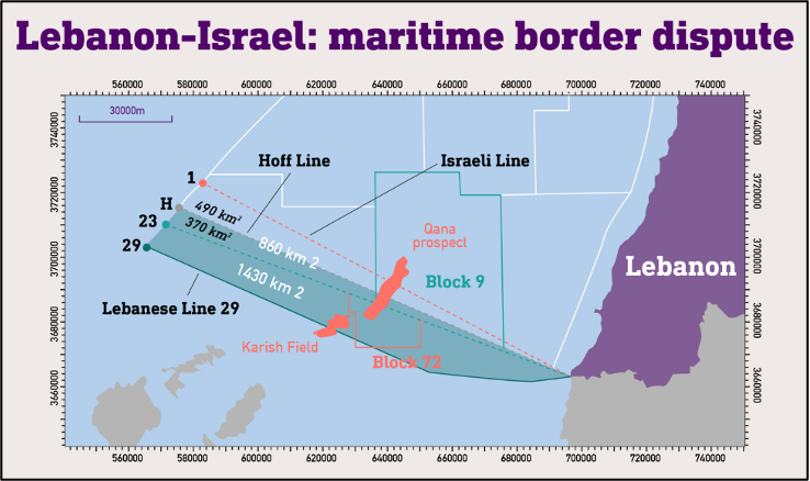 隣り合うレバノンとイスラエルは中東戦争の戦争状態が継続している形で国交がなく、陸上の境界も厳密には画定していないのだが、海上の境界も合意されていなかった。イスラエルで海上ガス田が発見・生産されることで、隣のレバノンでもガス田の存在が期待され、レバノン沖に石油ガスの探鉱鉱区が設定されるが、両国の境界部は係争地域となる。イスラエル側で2013年に発見されていたKarishガス田(埋蔵量は3兆立方フィート前後)は、その北半分がレバノンの主張する境界のレバノン側に位置し、2022年第3四半期生産開始を目指して進んでいた開発作業に対して、レバノンはクレームをつけ、ヒズボッラーは7月にドローン3機を飛ばして開発作業を妨害し(このドローンはイスラエル軍によって撃墜される)、「生産が開始されれば行動を起こす」と警告を発した。一方のイスラエルが主張する境界は、TotalEnergiesがオペレーターを務めるレバノンのBlock-8に食い込む。そしてそこには、試掘対象構造であるQanaプロスペクトが存在する。