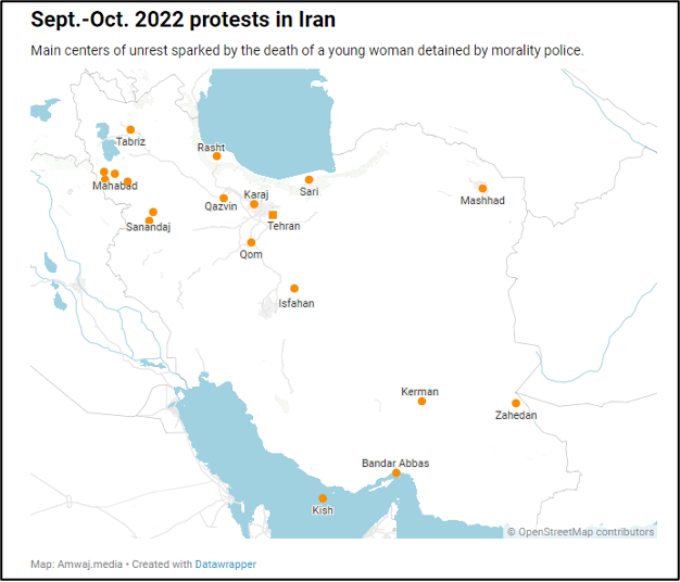 イラン西部にはクルド人が多く住むが、事の起こりはサッゲズに住む22 歳のクルド人⼥性Mahsa Amini (マフサー・アミーニー)が家族と⼀緒にテヘランの親戚を訪問していたところ、9月13日に⾵紀警察に逮捕され、拘留中の9月16日に死亡したことにある。警察官による女性虐待だとの非難のなか、サッゲズでの葬儀の後に抗議行動が起こり、抗議行動はサナンダジ、ディバンダレ、バネ、ビジャールを含むイラン西部コルディスターン州(クルディスタンのペルシャ語読み)の他の都市に急速に拡がった後、瞬く間に全国に拡大した。
